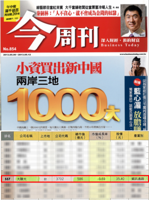 Award | WPG Holdings ranked No.557 of TOP 1000 in mainland China, Taiwan and Hong Kong in YR2013