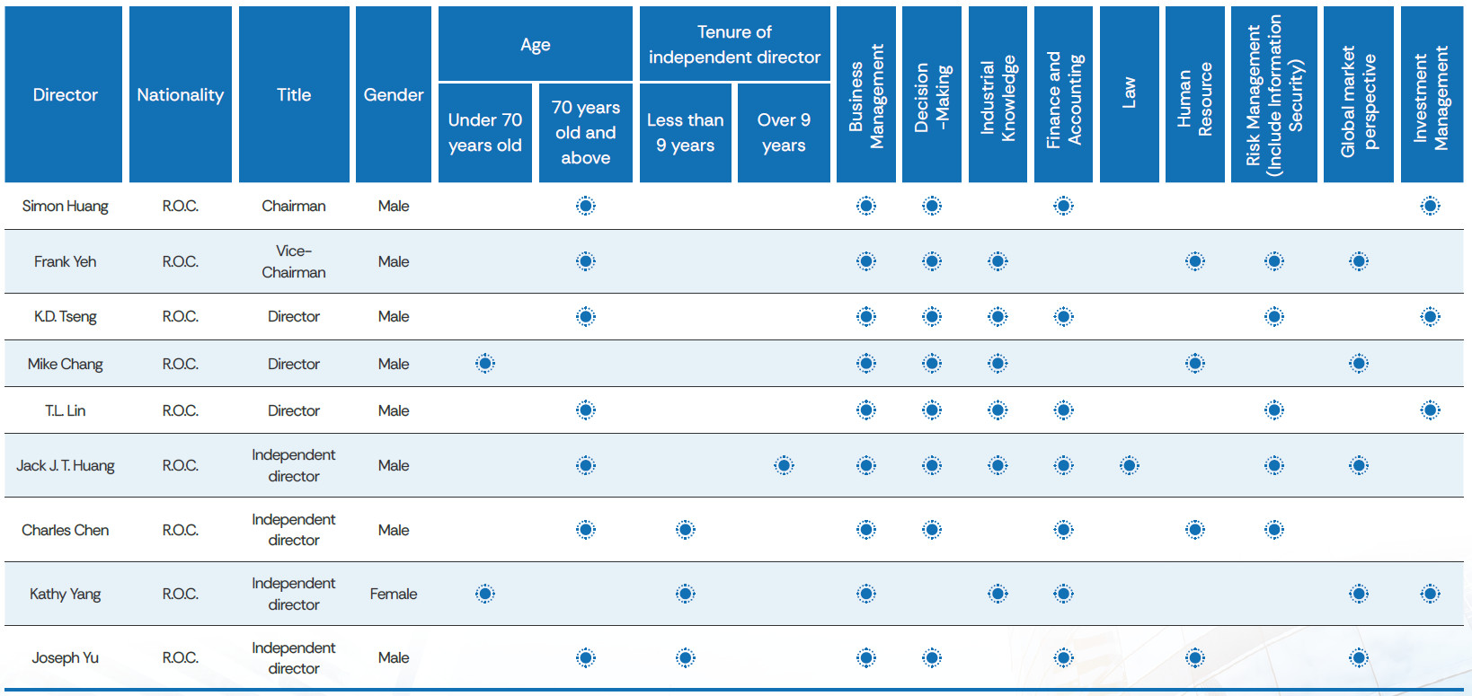 The selection and nomination of the Company’s Board of Directors is based on the provisions of the Company’s Articles of Incorporation, the Rules Governing the Election of Directors and the Corporate Governance Best-Practice Principles, and a candidate nomination system is used to elect directors in a fair, impartial and open process. The Company has established the “Method for Election of Directors” and the “Corporate Governance Best Practice Principles ,” which provides for a diversified approach to the composition of the Board of Directors. Based on the Company’s operations and development needs, and taking into consideration the views of stakeholders, the Company plans the appropriate composition of the Board of Directors and their successors by determining the professional background, expertise, industry experience, gender, age, and nationality of the directors.