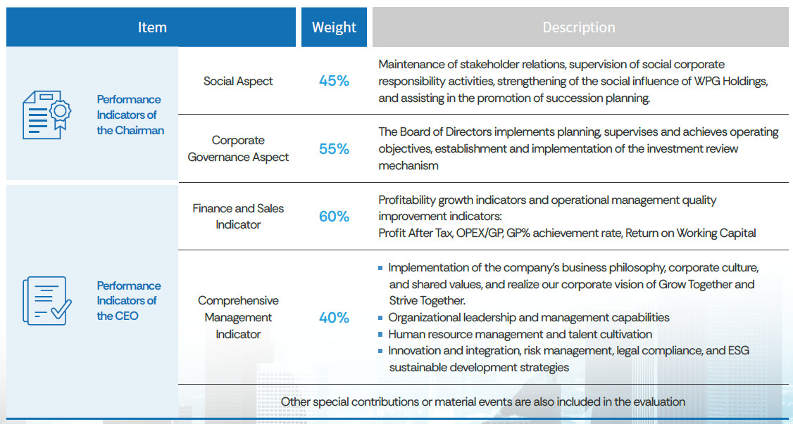 The Company’s Articles of Incorporation stipulate that the Company may pay compensation to its directors, regardless of the Company’s profit or loss, based on the directors' level of participation and contribution to the Company's operations, and in reference to domestic and international industry standards. The Company has established a Remuneration Committee to assist the Board in setting the compensation for directors and senior management, as well as in formulating the overall remuneration policy. A Board Performance Evaluation Policy is in place, under which the Board of Directors and its committees must conduct at least one internal performance evaluation annually, typically after the end of each fiscal year. The evaluation covers the execution and achievement of that year’s objectives. To align with international ESG evaluation standards and strengthen sustainable development, the Audit Committee continues to pursue a goal of ranking within the top 5% in corporate governance evaluations, with its performance incentives tied to the achievement of this goal. If there is a surplus at the end of the fiscal year, the distribution of directors' remuneration will be determined by a resolution of the Board of Directors based on the review and recommendation of the Remuneration Committee. Such remuneration takes into account the Company’s operational performance and each director’s level of participation and contribution. A fair and reasonable link is established between performance-related risks and the compensation received. The standards and reasonableness of director remuneration are reviewed and discussed by the Remuneration Committee at least once per term and submitted to the Board of Directors for approval. The Company will also review the director compensation system from time to time, in light of operational conditions and applicable laws and regulations, to strike a balance between sustainable operations and effective risk management.