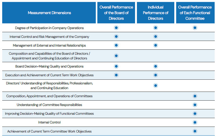 The measurement dimensions for the overall, individual, and functional committee performance evaluation of the Board of Directors include the following :