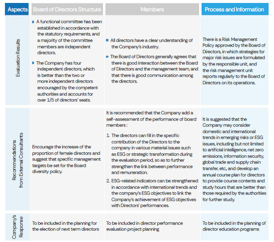 In accordance with Article 3 of the “Procedures for the Performance Evaluation of the Board of Directors,” an external professional independent institution or external expert and scholar team shall be commissioned to conduct the performance appraisal on the Board of Directors once per 3 years. The Company commissioned the external institution, “EY Business Advisory Services Inc.,” to conduct the latest external appraisal in 2022.