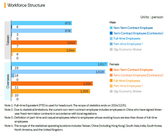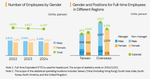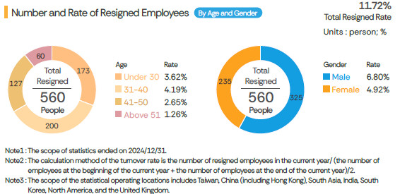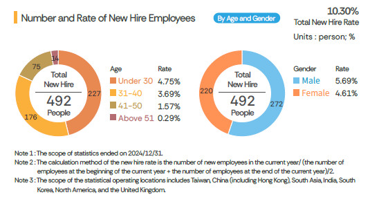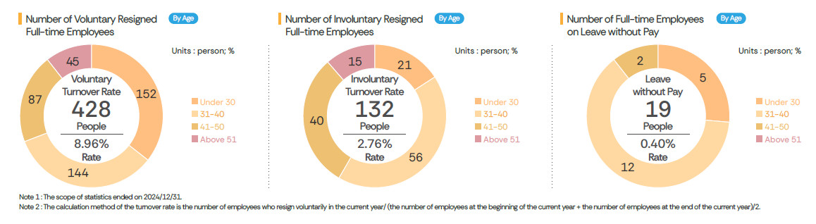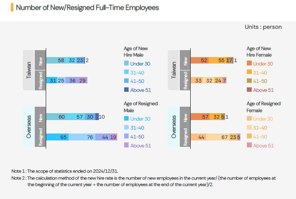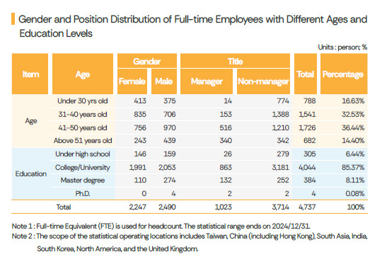 In 2024, WPG Holdings had a total of 4,737 full-time employees. In response to the company's development strategy, the layout of the organization and manpower had been organized, the personnel had decreased slightly compared with 2023. There has been little change in labor allocation and structure. In terms of gender, there were 2,247 female employees, accounting for 47.44% and 2,490 male employees, accounting for 52.56% of the workforce of WPG Holdings. In terms of age, the majority are 41~50 years old, accounting for 36.44%, followed by 31~40 years old, accounting for 32.53%. In terms of education level, employees holding bachelor’s degrees were the most common, accounting for 85.37%. In terms of the employees’ diversity policy, 13 persons with disabilities were employed, accounting for 0.27% of the total employees. In terms of turnover, there were 492 new hires in 2024, with a new hire rate of 10.30%; there were 560 resigned, with a turnover rate of 11.72%.