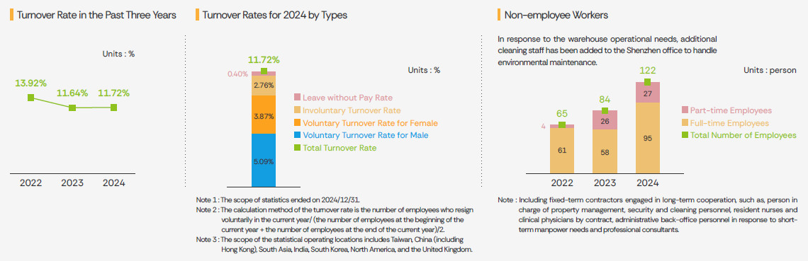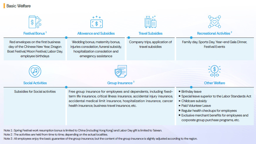 The basic welfare items meet employees' working requirements. Diversified welfare creates a good atmosphere between employees and their families to help employees recognize the company's operating philosophy and gradually builds performance welfare items to encourage employees in their work performances. In 2024, WPG Holdings received several prestigious awards, including the "National (Shenzhen) Outstanding Foreign Investment Enterprise and Harmonious Labor Relations Promotion Award" from the China Foreign Investment Enterprises Association, the "2024 China Annual Best Employer - Best Employer in Shanghai" from Zhilian Recruitment, the "2024 Extreme Flag Award - Best Human Resources Management Team" and "2024 Extreme Flag Award - Best Human Resources Shared Services Center" from HRflag, and the "2024 Happy Enterprise Silver Award" from 1111 Job Bank. These accolades highlight the company’s commitment to excellence in employee satisfaction and human resources management.