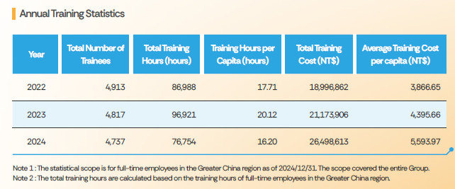 In 2024, the Group invested NT$26,498,613 in talent training, a 25% increase compared to 2023, demonstrating a continued commitment to employee development. Although the overall total training hours have decreased, the training hours per managerial employee have increased by 2%, and the training costs per employee have grown by 27%, indicating that training resources are more focused on in-depth learning for key talent, ensuring that the quality and effectiveness of learning resources are enhanced in tandem.