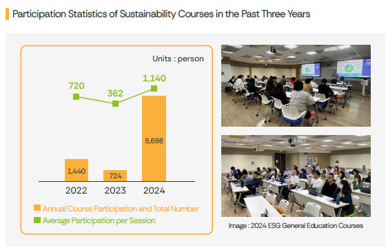 In 2024, a total of 5 courses were held, with a cumulative attendance of 5,698 employee learning sessions. The average satisfaction score was 4.7 out of 5, reflecting the high level of recognition of the course content by employees. Going forward, we will continue to promote sustainability training, designing customized professional courses for different groups to ensure the transmission of sustainability knowledge and guide employees from general awareness to specialized expertise in sustainability.