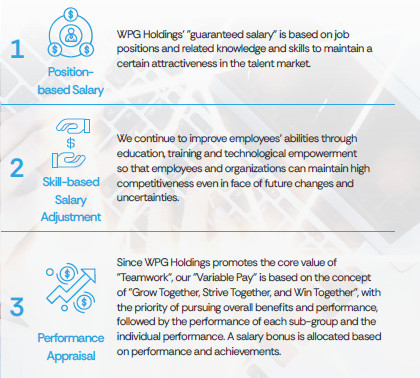 WPG Holdings focus on “performance” and “growth.” Thus, WPG Holdings’ remuneration policy not only emphasizes fair and open “clear rewards and punishments” but also focuses on three major principles: “position-based salary”, “skill-based salary adjustment “and “performance appraisal”.