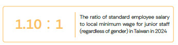 The ratio of standard employee salary to local minimum wage for junior staff (regardless of gender) in Taiwan in 2024 was 1.10:1, which is better than the local base salary.