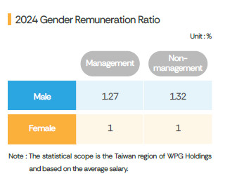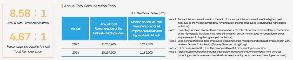 The median ratio of annual total remuneration of the highest paid individual to the annual total remuneration of all employees (except the highest paid individual) of WPG Holdings is 8.58:1. The ratio of the percentage increase in annual total remuneration of the highest paid individual to the median percentage increase in annual total remuneration of all employees (other than the highest paid individual) is 4.67:1. In the future, WPG Holdings will carefully review relevant remuneration information through various indicators, fully consider the operation and sustainability aspects and implement corporate social responsibility as its mission.