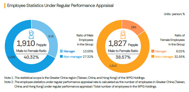 WPG Holdings adopts the spirit of PDCA for the performance appraisal, setting goals at the beginning, tracking the progress of the work, adjusting the goals in the middle, and evaluating at the end of the year. In 2020, WPG Holdings introduced the performance management system, with the aim to transform it into a development-driven performance management system with the strategic model of "tools can change behavior, behavior can change ideas, and ideas can change thinking patterns". This system links organizational goals at all management levels so that the goals of employees are consistent with that of the organization. Furthermore, the manager has the function of guiding and giving feedback on employees' work performance. Each employee can request feedback from others at any time through the system, and supervisors can thereby thoroughly understand the performance of employees. Through a development driven performance management mechanism, WPG connects organizational goals, personal goals, and talent development. All performance records will be used as the basis for subsequent cultivation and development, thereby improving overall organizational effectiveness. All appraisals and promotions are based on professionalism and employee performance, with no gender or sexual orientation discrimination. In 2024, 100% of the qualified employees in Greater China completed the performance appraisal.