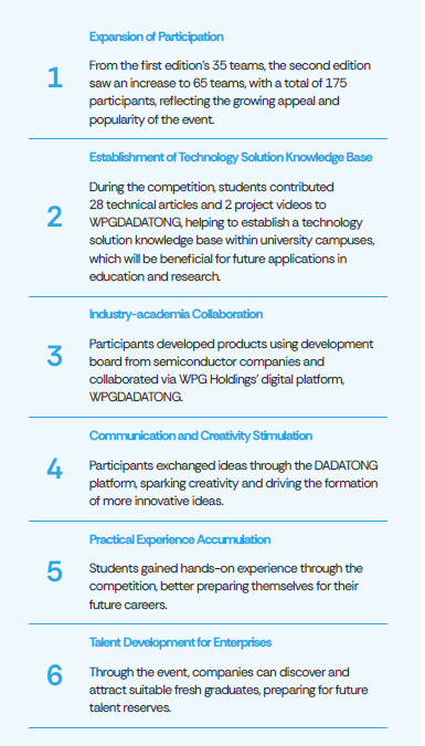 The 2nd Tech Friends Maniac Campus Design Competition saw an increase in participation from the first edition, with 65 teams from 33 schools and a total of 175 participants, compared to 35 teams from the previous year. Through these two campus competition events, WPGDADATONG has built a technology solution knowledge base across university campuses. The original manufacturers also had the opportunity to introduce their latest application products to students, allowing them to engage with these products during their learning stages. Through communication via the WPGDADATONG platform, creativity was sparked among participants, helping students accumulate practical experience while allowing companies to identify suitable newcomers to the workforce. Ultimately, 15 teams were selected for the finals, each receiving NT$10,000 for development expenses, and a total of NT$300,000 in prizes was awarded based on the judges’ results.