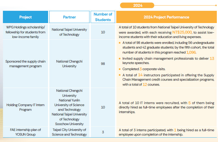 In 2024, WPG Holdings provided scholarships, internship projects and laboratory projects in many universities. It not only encourages young people to study but also provides excellent students with practical experience. At the end of studies, the students may become formal employees; therefore, a win-win situation may be created between WPG Holdings and students.