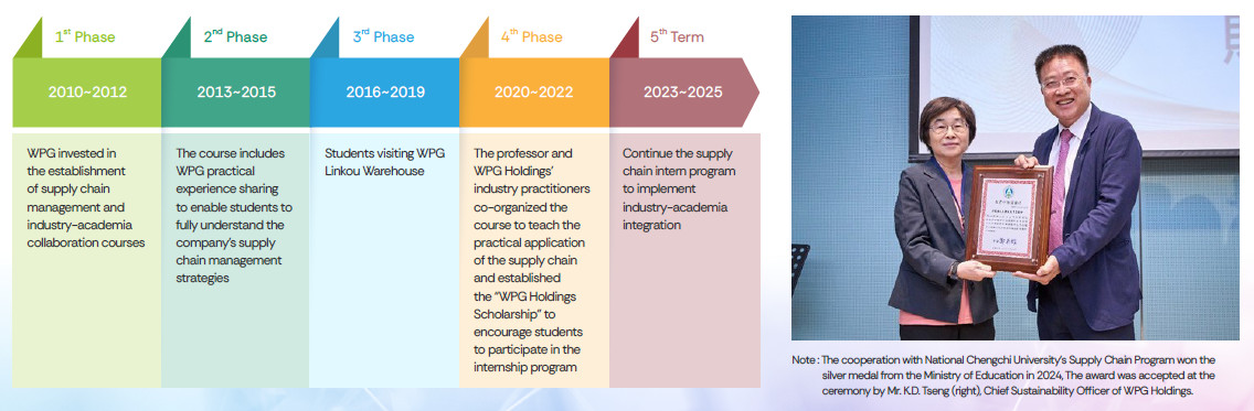 WPG Holdings has partnered with the College of Business, National Chengchi University since 2010 to sponsor and support the “Supply Chain Management Industry-Academia Collaboration Project.” As of 2024, the Project has entered its 14th anniversary. The Collaboration aims to organize the knowledge of supply chain management in Taiwan and create a complete set of supply chain management teaching materials and plans, in order to provide supply chain management talents to Taiwan’s industries as the ultimate goal.