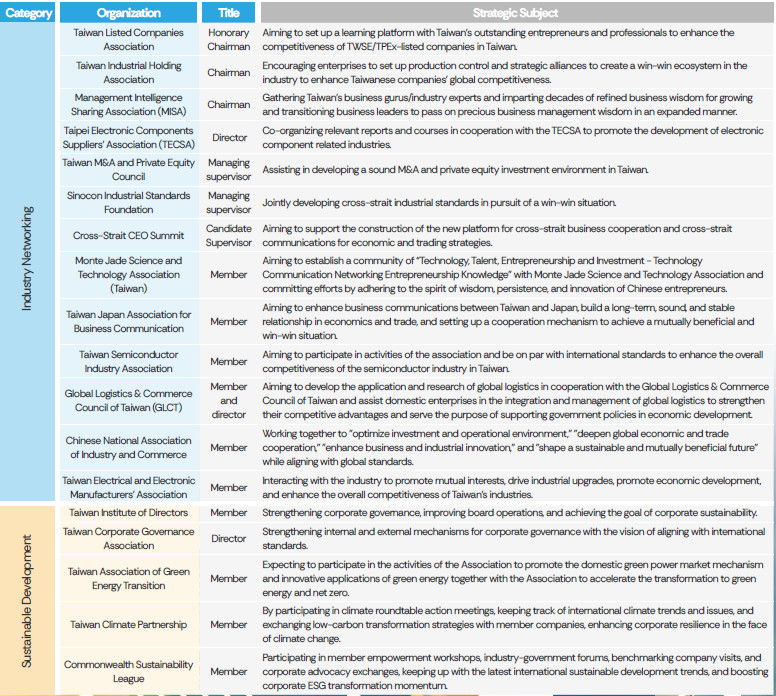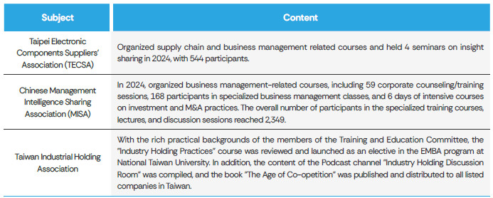 The association continues to promote industrial holding knowledge. In 2024, it collaborated with Senior Advisor Jung-Jui Tu and leveraged the practical expertise of members from the Education and Training Committee to publish Industrial Holding Practice. The book was successfully adopted as an elective course in the NTU EMBA program, where enrollment exceeded the quota—highlighting the growing relevance of industrial holding strategies in today's evolving industrial landscape, particularly as companies reevaluate their transformation and upgrade pathways.