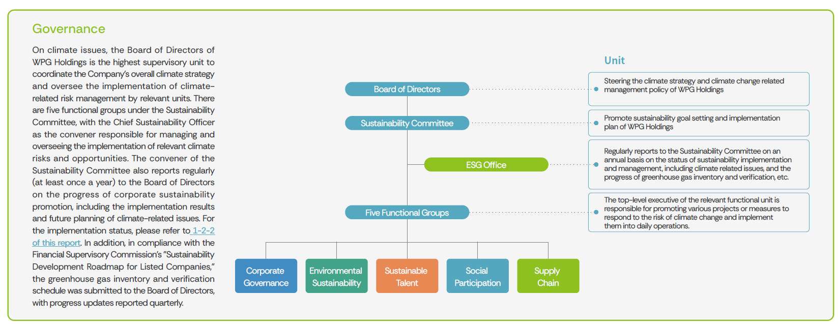 WPG Holdings has made reference to recommendations on climate change-related financial disclosures issued by the Task Force on Climate Related Financial Disclosures of the Financial Stability Board (FSB) of the United Nations and conducted the current situation analysis, climate risk and opportunity identification, and scenario analysis of climate change-related financial disclosures, which are described in the following four scopes :