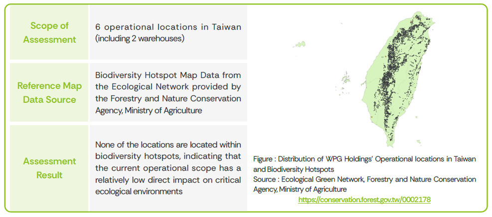 To further strengthen biodiversity management, WPG Holdings conducted a biodiversity impact assessment for 6 operational locations in Taiwan, including 2 warehouses. The assessment utilized biodiversity hotspot data from the Ecological Green Network provided by the Forestry and Nature Conservation Agency under the Ministry of Agriculture, to determine whether any sites are located within biodiversity hotspots. The results indicated that none of the Company’s operational sites are situated within biodiversity hotspots, suggesting that the current scope of operations has a relatively low direct impact on critical ecological environments. Nevertheless, WPG Holdings will continue to monitor the potential ecological impacts of its business activities and incorporate biodiversity considerations into site selection criteria for future construction or expansion projects, in order to minimize environmental disturbance.