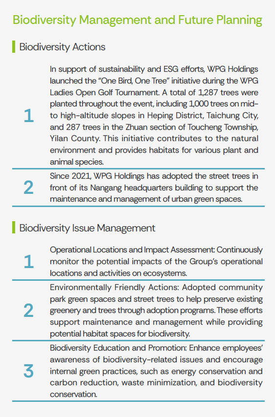 WPG Holdings recognizes the critical role of biodiversity in maintaining ecological stability and balance and believes that biodiversity conservation should go hand in hand with business development. In 2024, biodiversity was incorporated into the Company’s sustainability management topics, with close attention paid to the potential impacts of operational activities on biodiversity. Where impacts are identified, the Company will proactively implement mitigation measures to ensure a harmonious balance between business growth and environmental preservation.