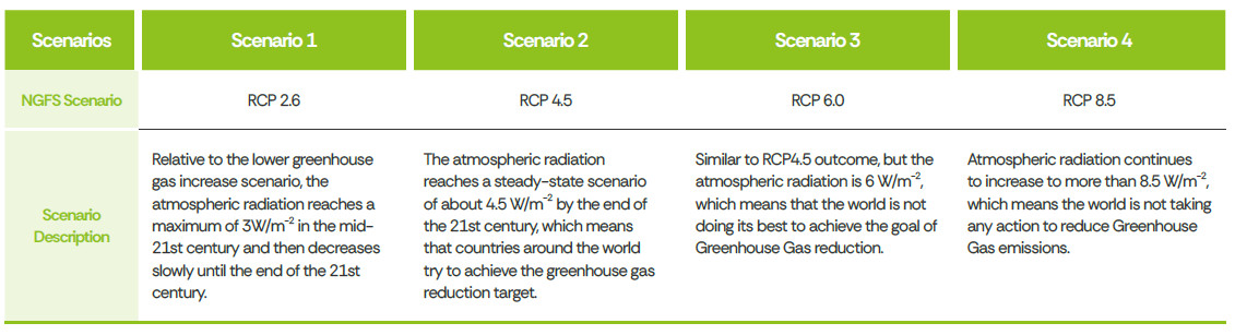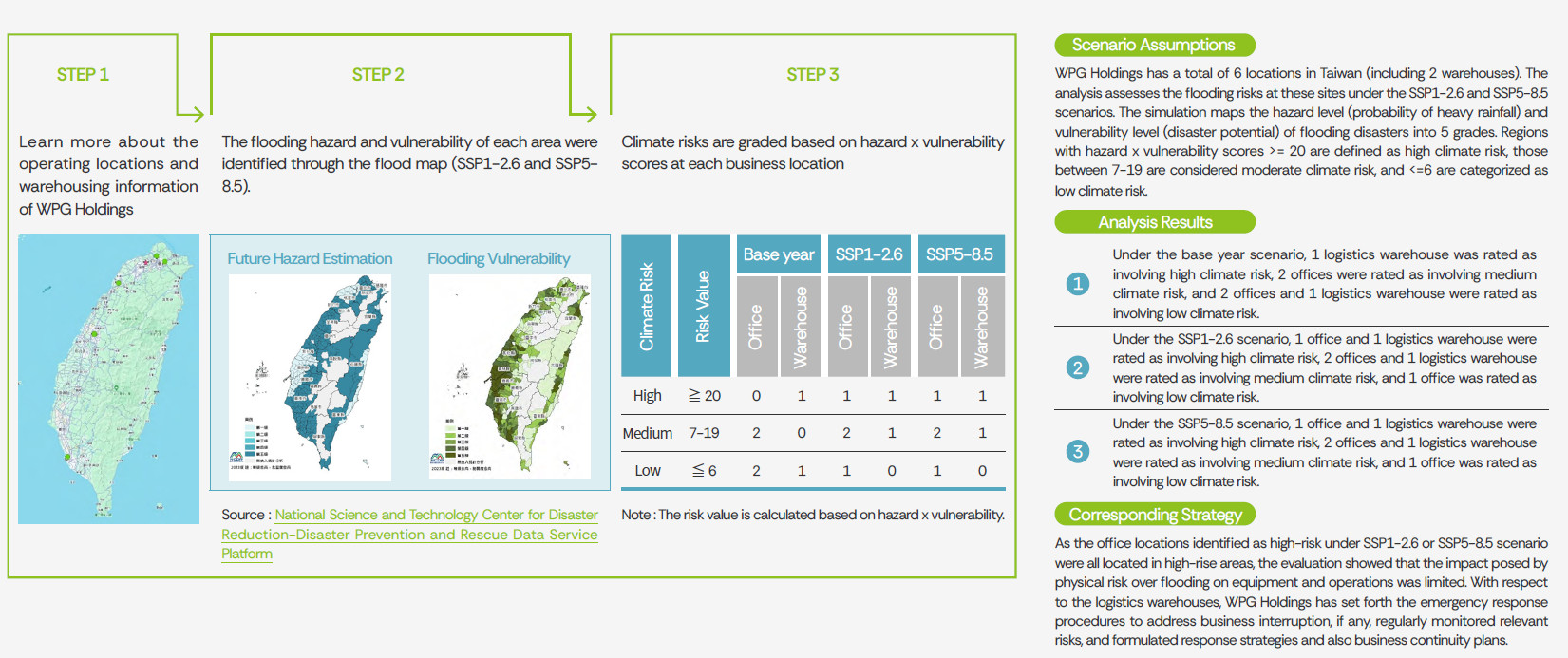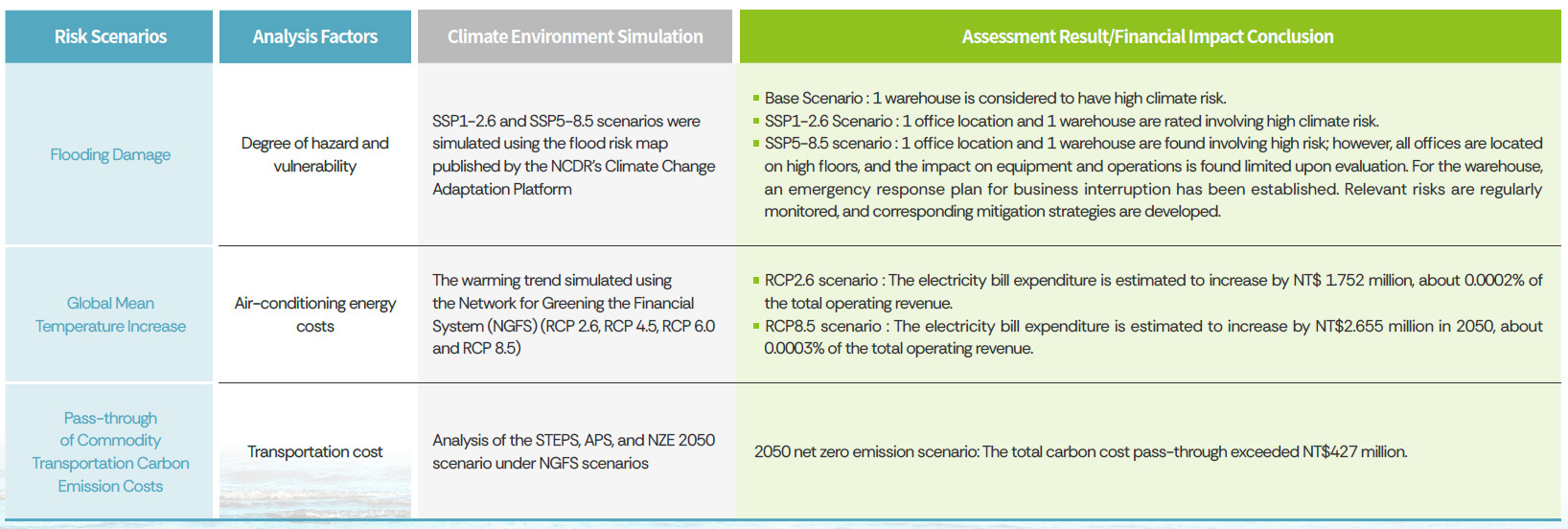 The global average temperature rise controlled within the range of 1.5°C is the goal for all of the people. However, there is still a considerable gap between various countries’ policies and this goal. In order to respond to the risksand impacts caused by various possible climate paths in the future, WPG Holdings, through the climate change scenario analysis, assessed 2 physical risks (flooding disasters and global mean temperature Increasing) and 1 transition risk (pass-through of the carbon emission costs for transportation of commodities), as well as the risk impacts under various scenario hypotheses. Meanwhile, it also formulated appropriate response strategies to mitigate the potential impacts posed by climate risks. The risk scenarios, analysis factors and assessment results are disclosed as follows :