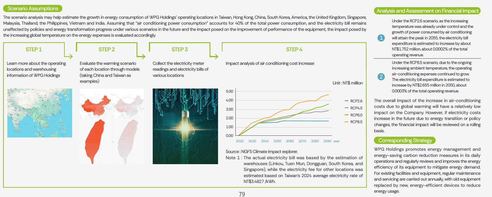 The most direct impact of the global mean temperature rise is the growth of energy demand for air conditioning, WPG Holdings is a semiconductor components distributor, with its operational locations primarily consisting of offices and logistics warehouses. During its operations, energy consumption is concentrated in smart warehousing systems and air conditioning equipment, with electricity usage for air conditioning being the main source of energy consumption. The Company simulates the temperature change of each location under different global average warming environments and the warming trend under different scenarios (RCP 2.6, RCP 4.5, RCP 6.0, RCP 8.5) by referring to the Networking for Greening the Financial System (NGFS) and estimates the occurrence time and financial impact of global mean temperature increase through electricity usage and average electricity cost of each location.