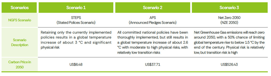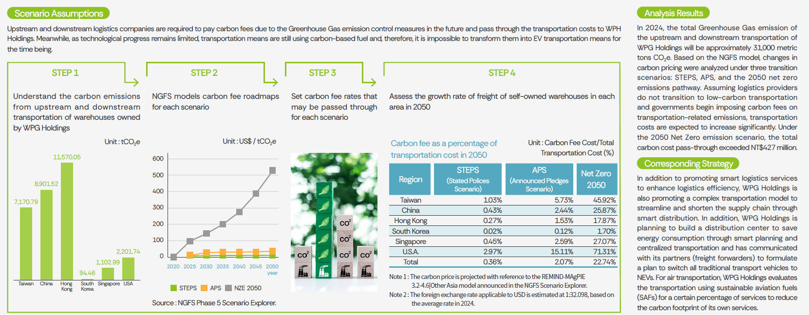 In order to reduce Greenhouse Gas emissions, the trend in recent years has been to levy carbon fees or carbon taxes on carbon emissions, forcing manufacturing companies to begin to focus on greenhouse gas reduction. Although WPG Holdings is not a large greenhouse gas emitter, but the upstream and downstream logistics and transportation process may also generate a large amount of Greenhouse Gas emissions. If the future for the transport of Greenhouse Gas emissions need to begin to collect carbon fees, it may face the logistics manufacturers due to the imposition of carbon fees and pass on costs, resulting in increased costs of transportation. The Company referenced the Network for Greening the Financial System (NGFS) to simulate changes in carbon pricing under various transition scenarios. Based on the estimated greenhouse gas emissions from upstream and downstream transportation at each warehouse, the potential cost pass-through from logistics and transportation was assessed.