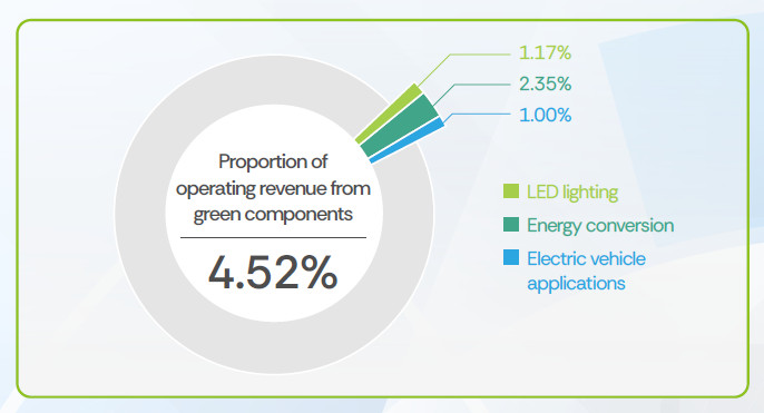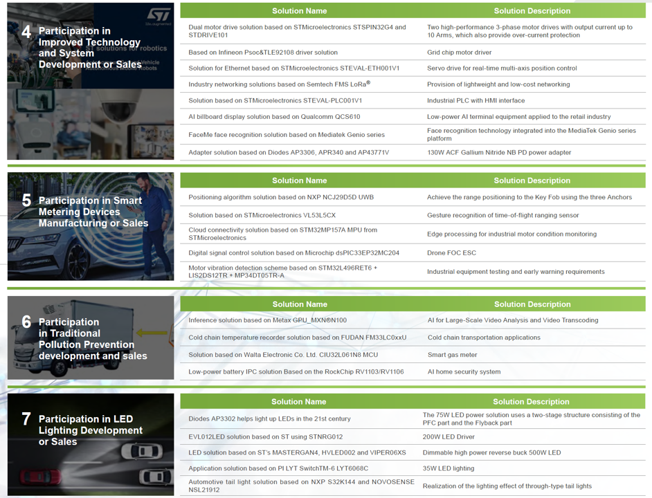 WPG Holdings continues to expand its presence in the clean technology sector by developing a broader range of application solutions to meet evolving market demands. Cleantech-related solutions cover the applications under 7 major categories. In 2024, WPG Holdings developed and updated 150 Cleantech-related solutions, covering new energy development, battery manufacturing or distribution, industrial automation technology manufacturing or distribution, smart metering device manufacturing or distribution, LED lighting development or distribution, traditional pollution control development and distribution, and improved technology and system development or distribution. These accounted for 70% of the total solution portfolio in 2024, with operating revenue growing by 43% from the same period of 2023. Among these, green components contributed to 4.52% of WPG Holdings' total revenue, including 1.17% from LED lighting, 2.35% from energy conversion, and 1.00% from electric vehicle applications.