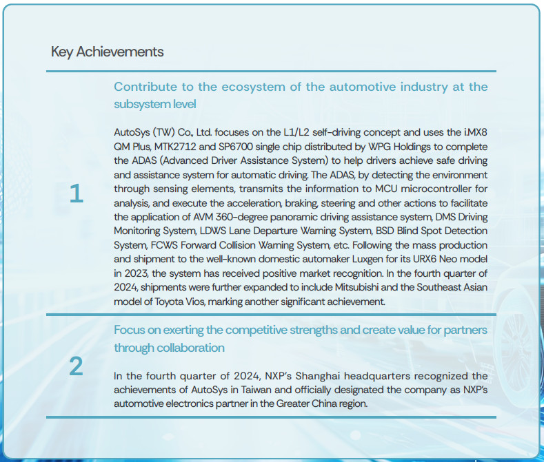 WPG Holdings invested NT$75 million in the external company, AutoSys (TW) Co., Ltd., to promote the development of advanced driver-assistance systems (ADAS) and smart cockpit products for electric vehicles. In 2023, the company achieved a key milestone with the mass production and delivery of these solutions to the well-known domestic automaker Luxgen for its URX6 Neo model, which has since received positive market recognition.