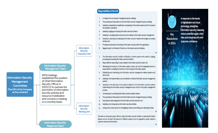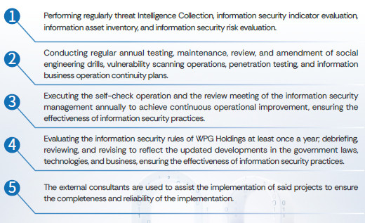 For the purpose of executing the diverse tasks of the information security management system effectively, WPG Holdings has formulated various information security development directions and strategies and established the "Information Security Management Committee" to manage the operation of the Company's information security management system, including the execution of the tasks of information security-related topics, formulation of procedures, review and other information security matters. Through the operation of the information security organization, the information security management system continues with a steady operation.