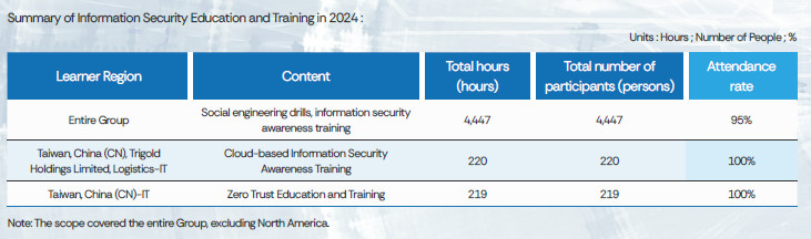 The information security execution unit plans the education and training of information security annually. They collect, track, and integrate the results of education and training, and formulate the goals and basic hours (3 hours) of information security education and training that the colleagues need to receive annually. In accordance with the arrangement of current information security, when the employees are formally appointed, new employees will be arranged to receive training on information security topics to ensure the understanding of their responsibilities and obligations, to enhance the employees' information security awareness. They advocate the precautions related to the recent information security incidents to the managers and the employees of the whole group, assisting the colleagues to increase information security awareness.