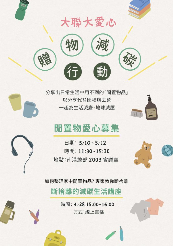 由同仁自發性捐贈日常生活中用不到的「閒置物品」🚼,以分享代替囤積與丟棄,一起來為生活減廢、地球減壓,同時幫助公益團體及弱勢家庭;活動期間共募集65箱物資,透過贈物網平台轉贈服務,將物品留傳給下一位惜物者👴🏼。