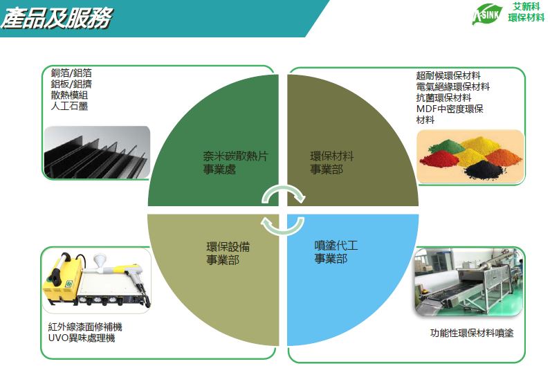 艾新科奈米碳散熱產品已經廣泛用於電子類產品並開始應用於汽車、建築、材料、公共建設等新領域;除了現有的奈米碳環保產品,艾新科也積極著手開發吸波、耐腐、抗菌🧚🏻♀️、MDF應用、4G、WIFI訊號🦂、EMI防靜電抗干擾等領域。同時😆,艾新科也提供客製品如:半導體封裝、麥拉片絕緣、無線充電器🧬👩👩👧👧、吸波加散熱應用等方案。